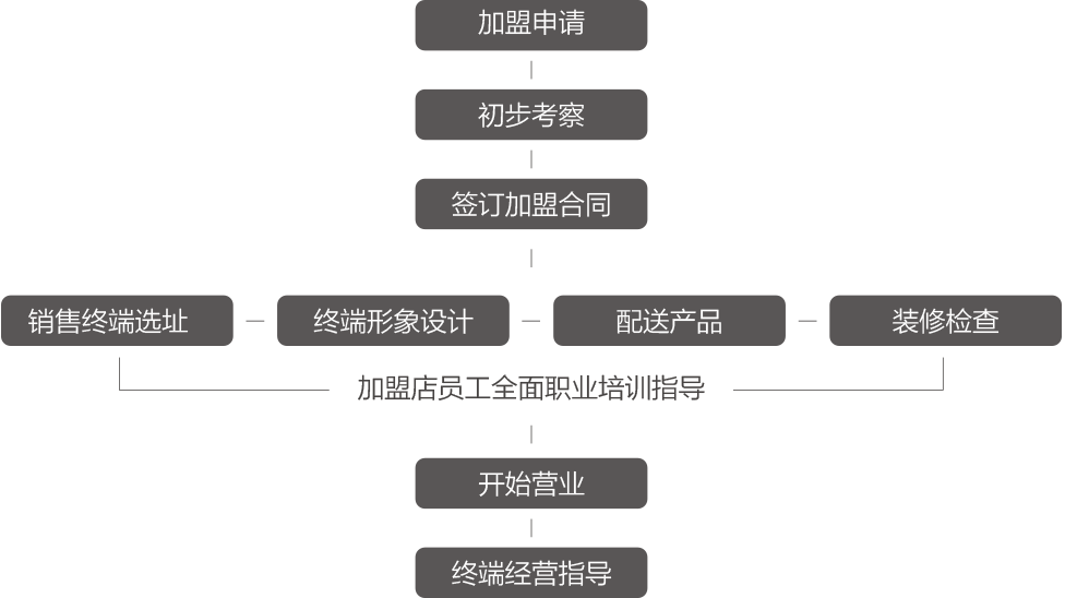 公司强大的市场团队长期投身前线,为各地加盟商的店面运营、推广、促销、团队管理等经营活动长期提供技术指导,帮助加盟商无压力经营。